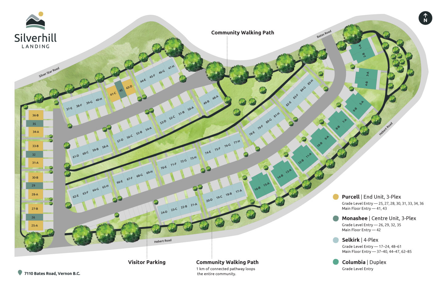 Set within Vernon’s BX Foothills, the community is thoughtfully woven into a network of multi-use trails — placing hiking, biking, and everyday connection to nature just steps from your front door. A kilometre-long walking path winds through the site, perfect for morning walks and evening strolls.